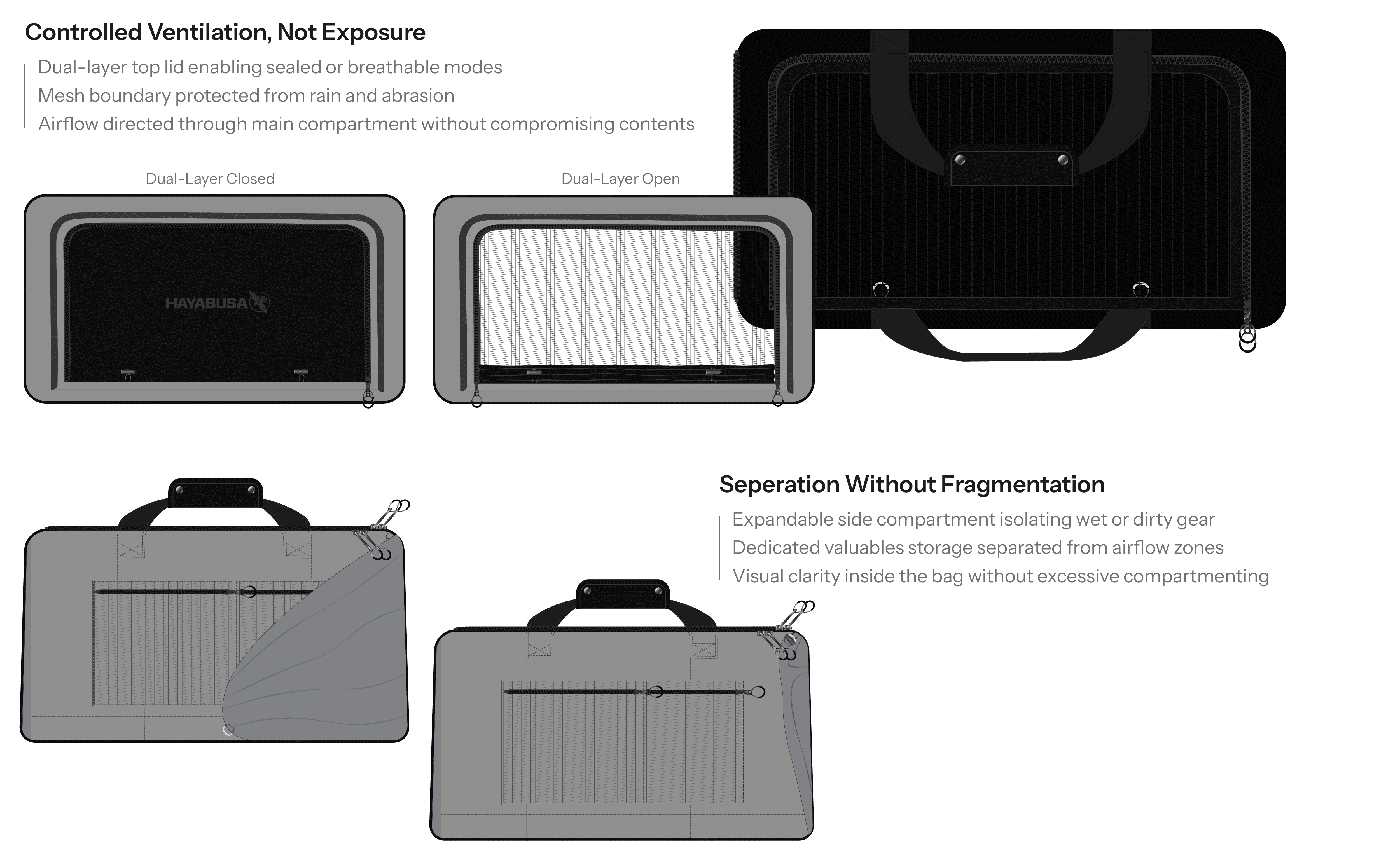 Combat athletes carry bulky, sweat-soaked gear that traditional athletic bags fail to organize, ventilate, or protect effectively. The Airstream system introduces a controlled dual-layer ventilation architecture, giving athletes the ability to choose between sealed protection and breathable airflow depending on their needs.