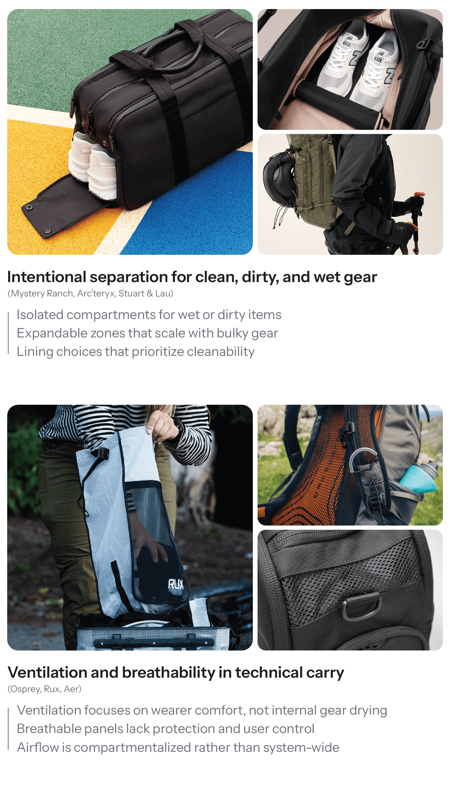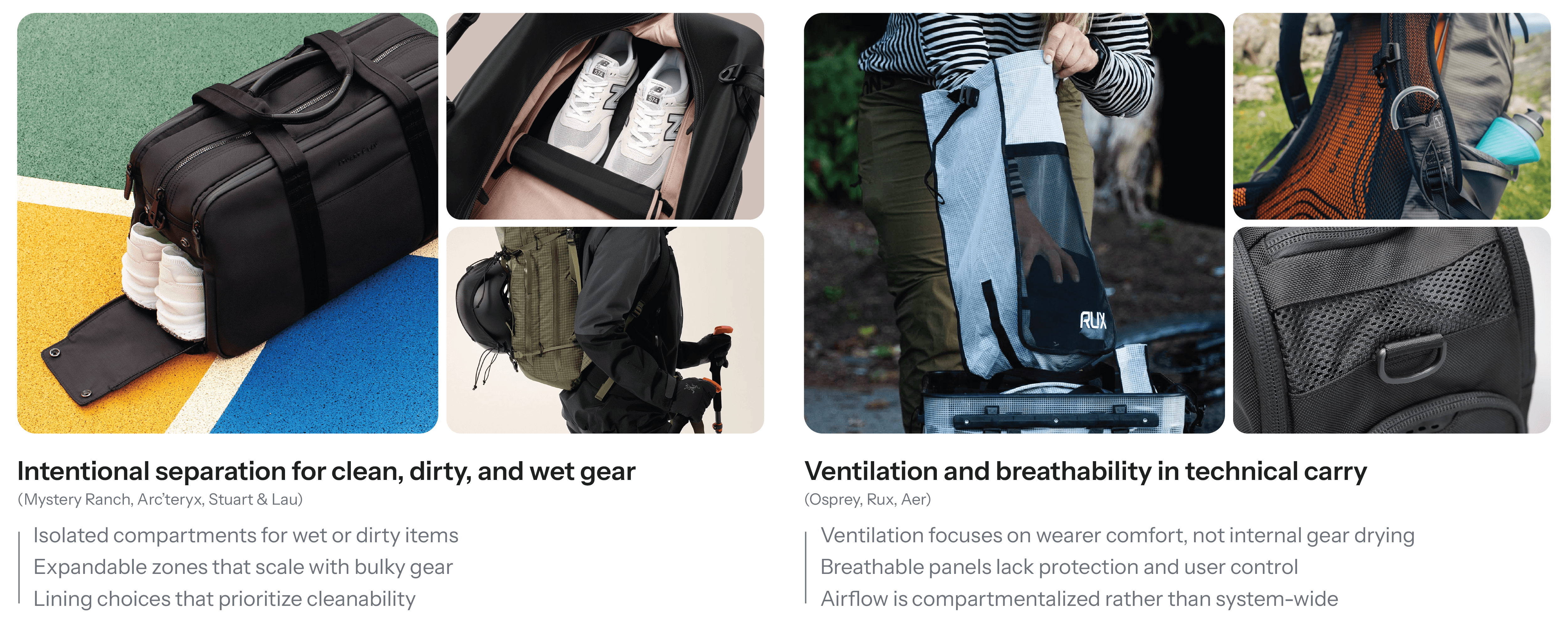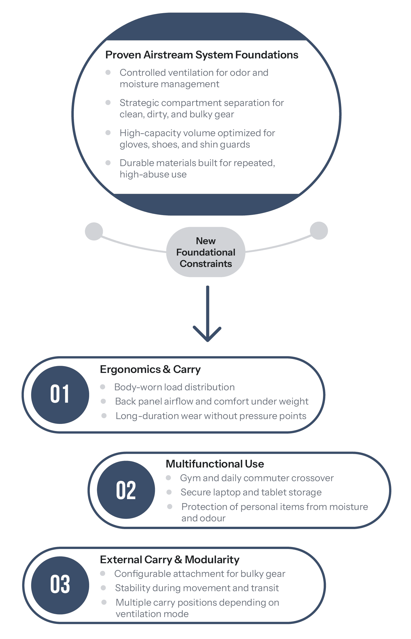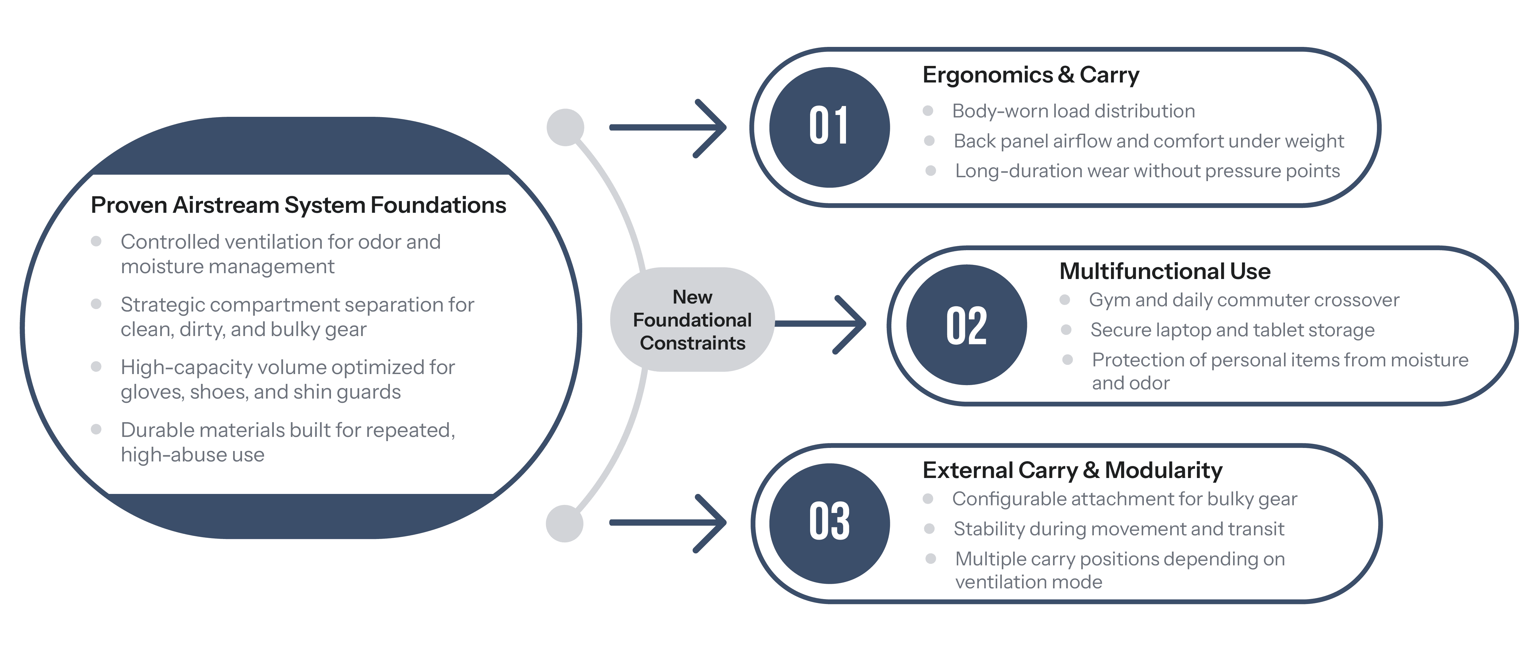Expanding the Airstream platform from a volume-based duffle into a load-bearing backpack reinforced the importance of architectural thinking in soft goods design. What began as a ventilation and separation concept evolved into a more complex structural challenge, requiring careful integration of load distribution, ergonomic comfort, and modular external carry.