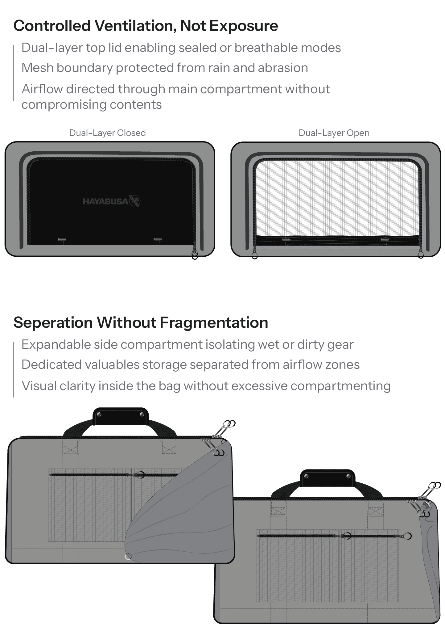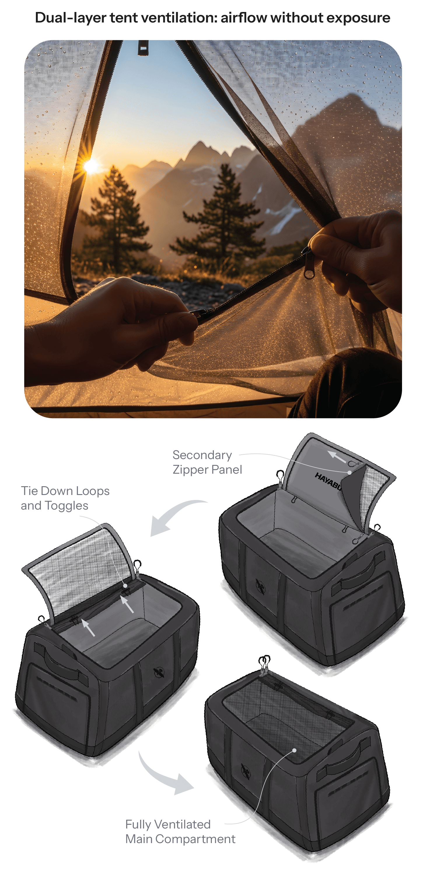 Few bags use controlled dual-layer airflow systems. That insight emerged through studying camping tents, where ventilation manages airflow without exposing contents to the elements.