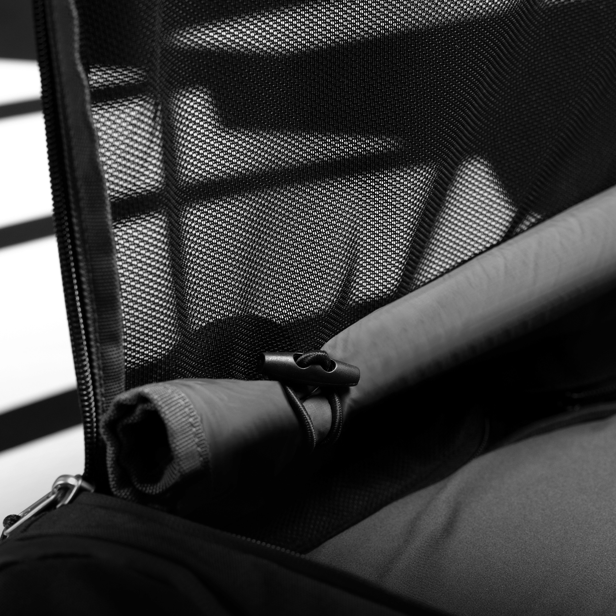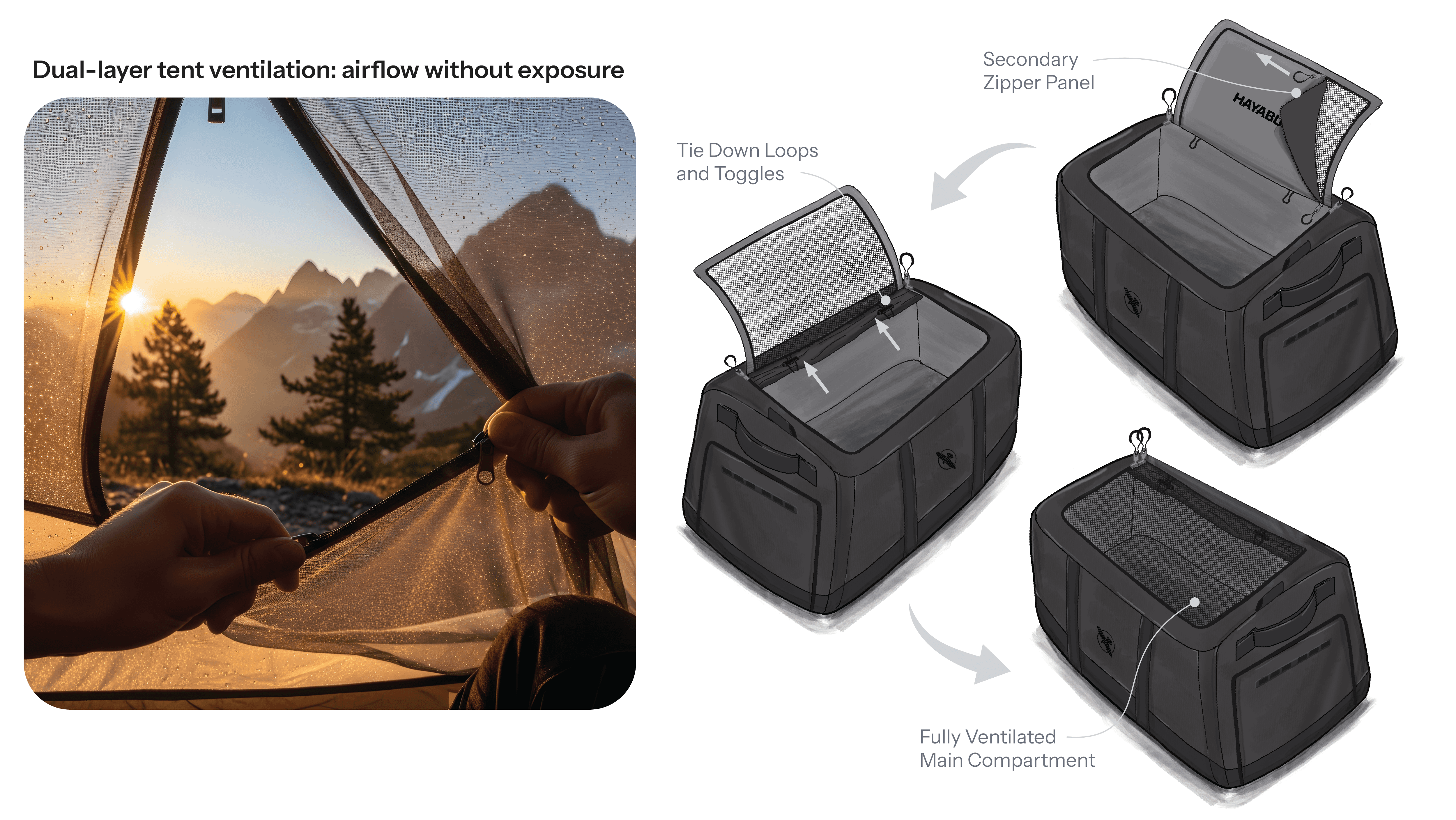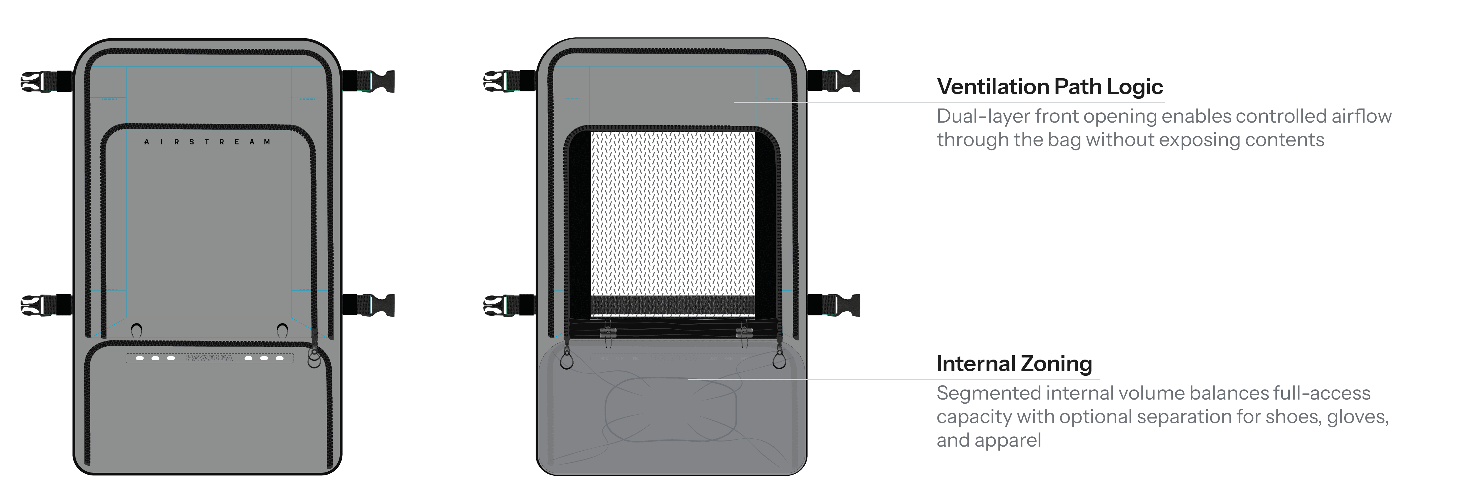 This principle directly informed the Airstream system, translating tent-style dual closures into a scalable carry solution. By pairing a protective inner panel with a breathable mesh exterior, the system allows users to actively choose between sealed protection, partial, and full ventilation, regardless of bag format.