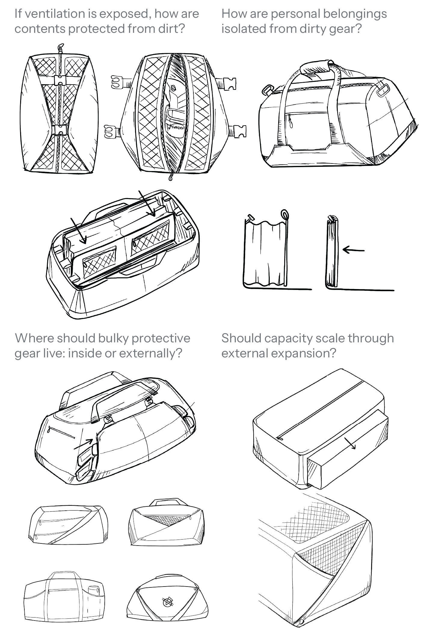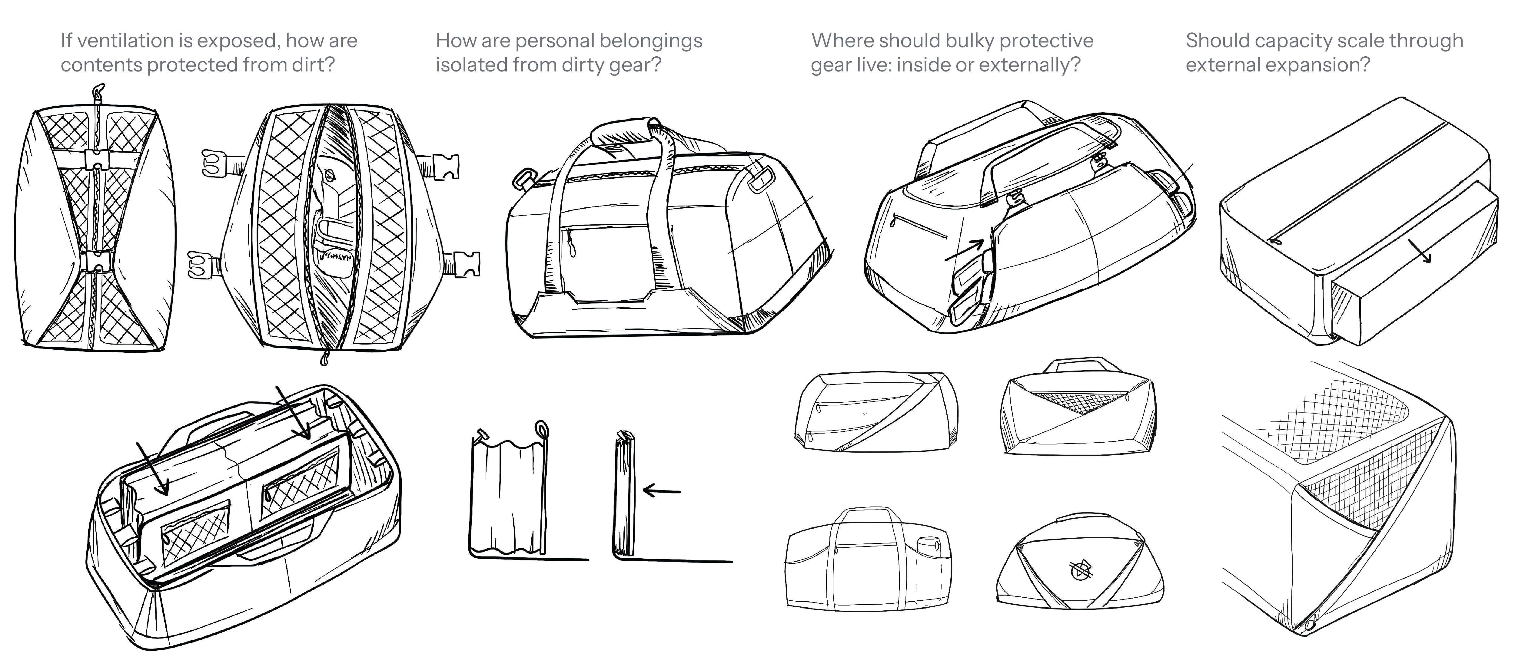 The goal was to establish a ventilation architecture that could control airflow, manage separation between wet and dry gear, and integrate seamlessly into different carry formats. Rather than designing isolated compartments, each component was developed as part of an interconnected system balancing breathability, protection, and construction feasibility before entering sampling.