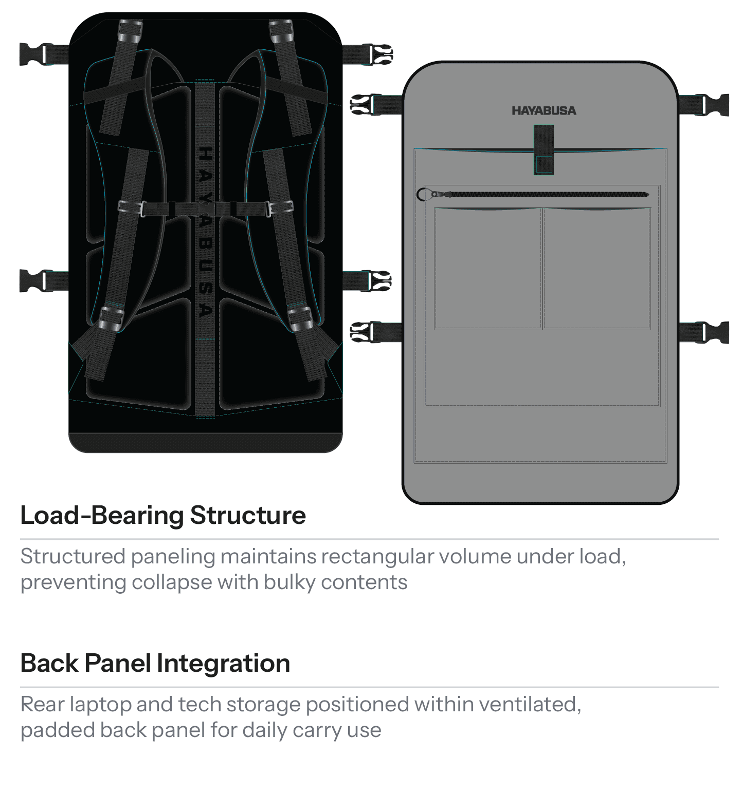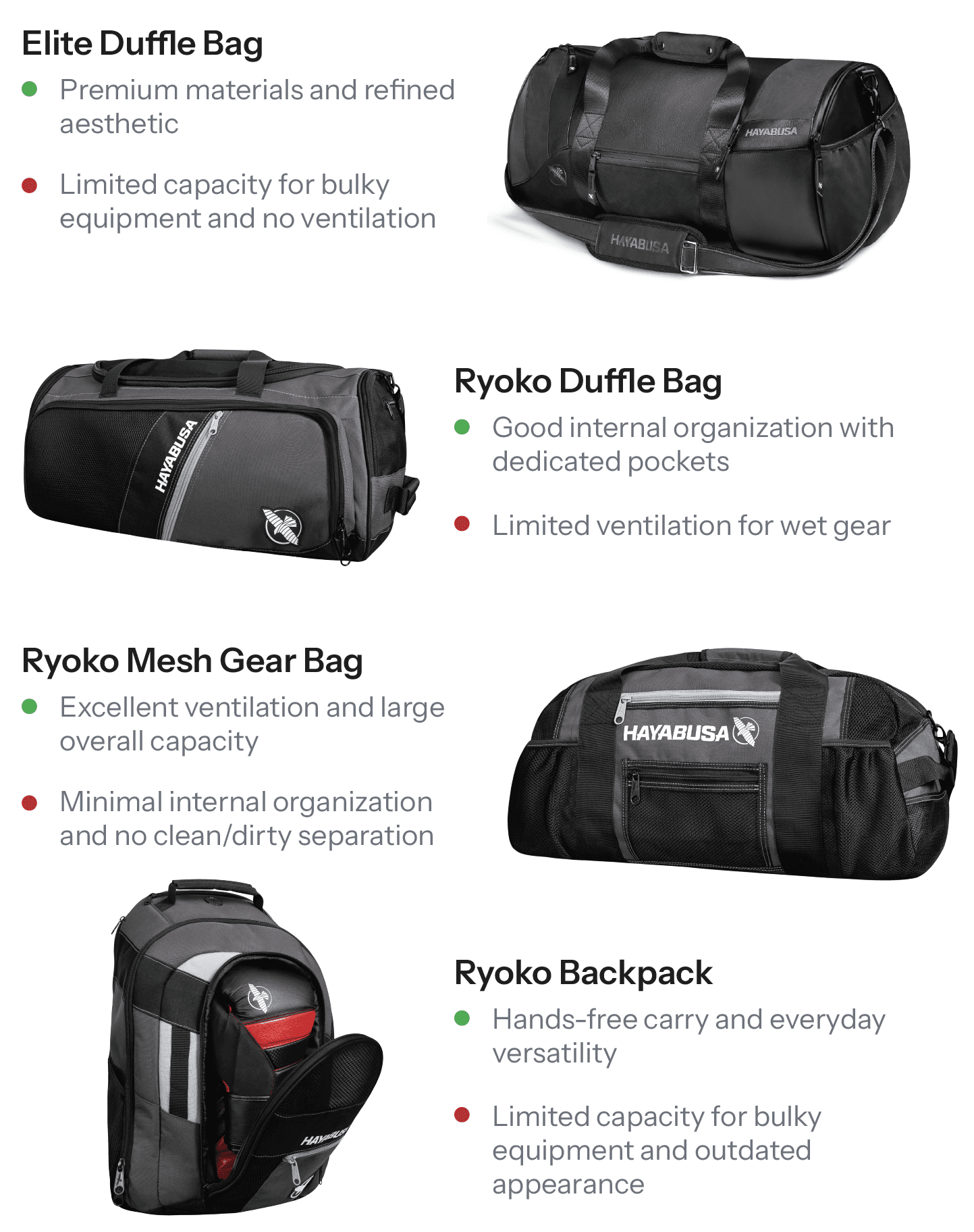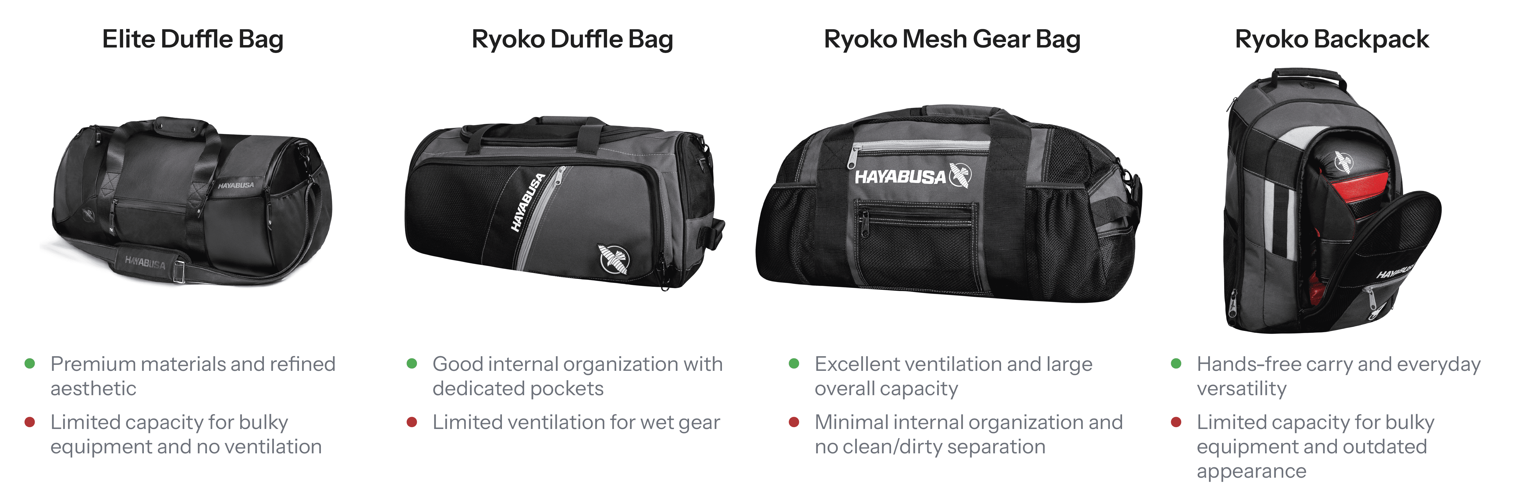 Before exploring external competitors, I evaluated Hayabusa’s existing carry products to understand where current solutions performed well and where opportunities for improvement existed.