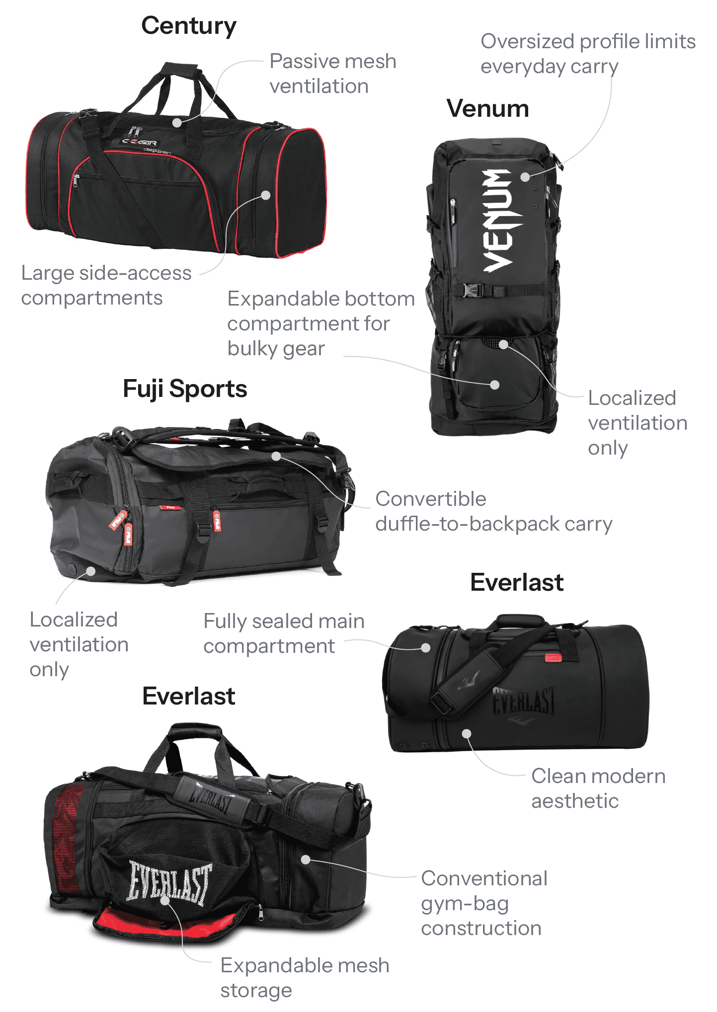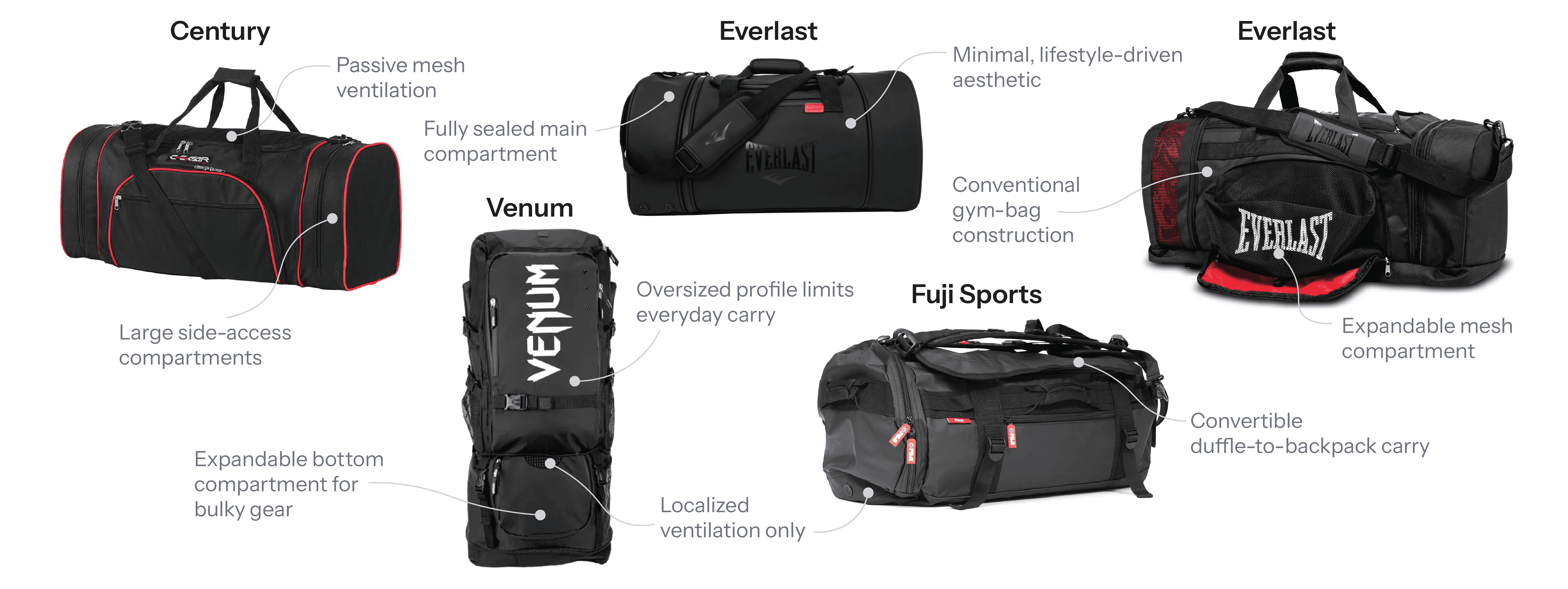 Existing combat-sports bags reveal consistent tradeoffs between capacity, organization, and ventilation.