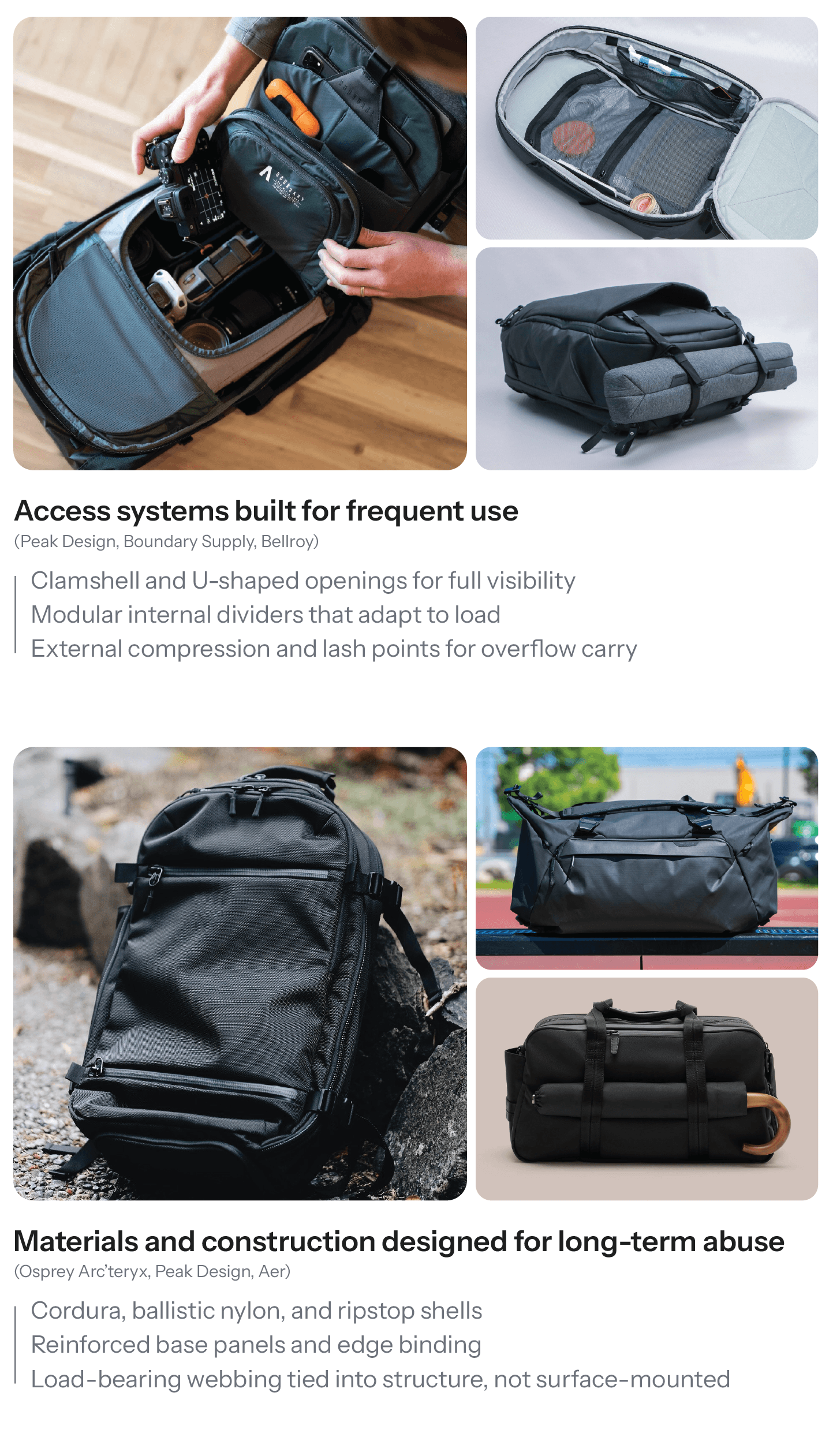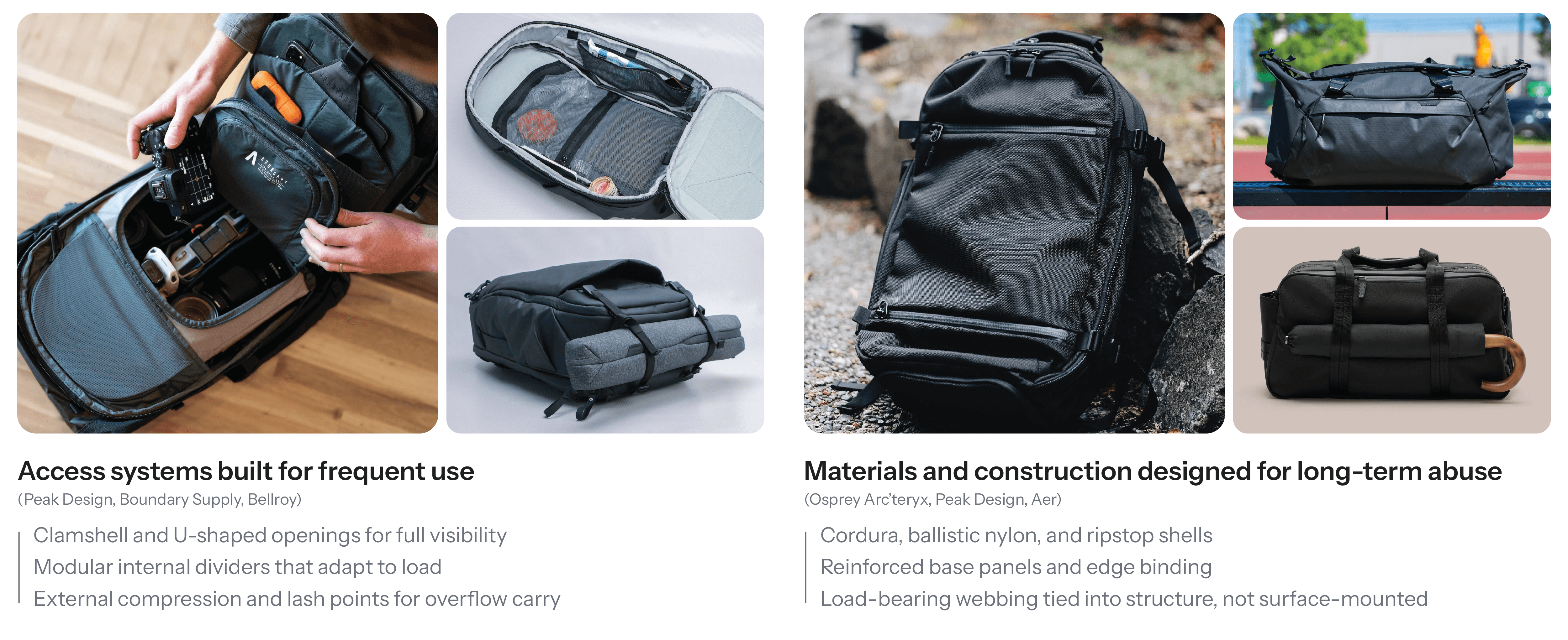 To push beyond conventional gym and combat bags, I studied high-performance carry systems across technical commuter, travel, camera, outdoor, and winter sports categories. While these products serve different use cases, they consistently solve for durability, modular organization, and load adaptability in ways combat-sports bags often overlook.