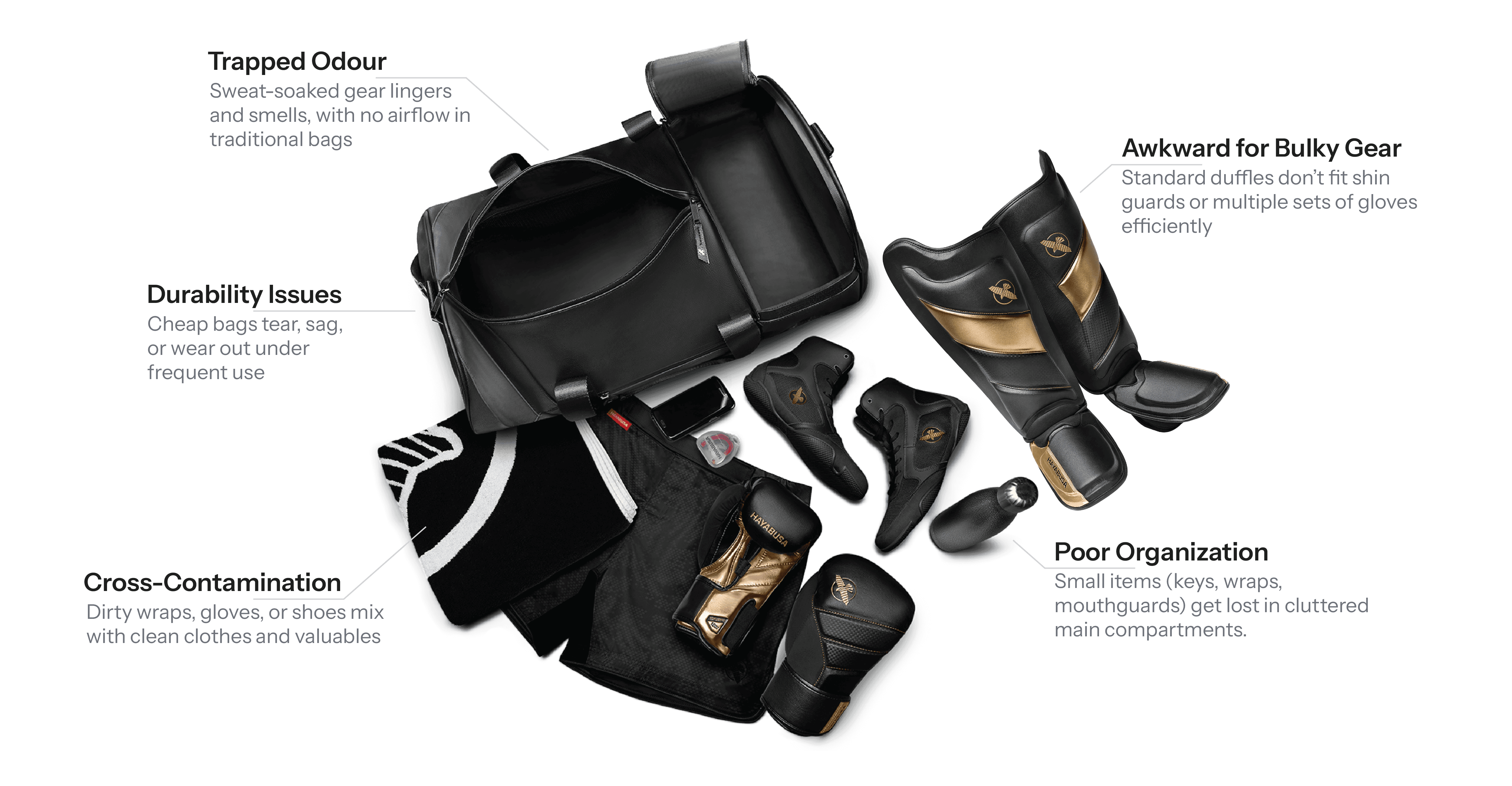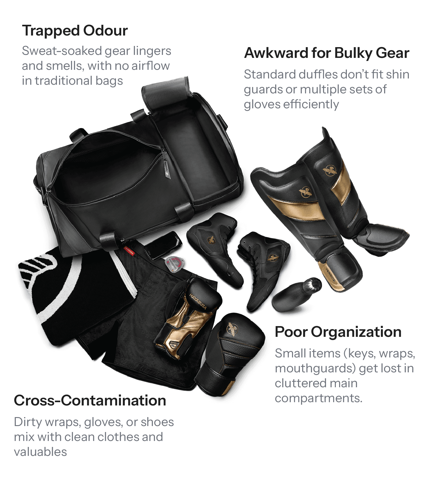 Traditional athletic bags are not designed for combat sports. Gloves, shin guards, wraps, and sweat-soaked apparel are forced into single compartments, leading to poor organization, trapped moisture, odor buildup, and accelerated gear wear.