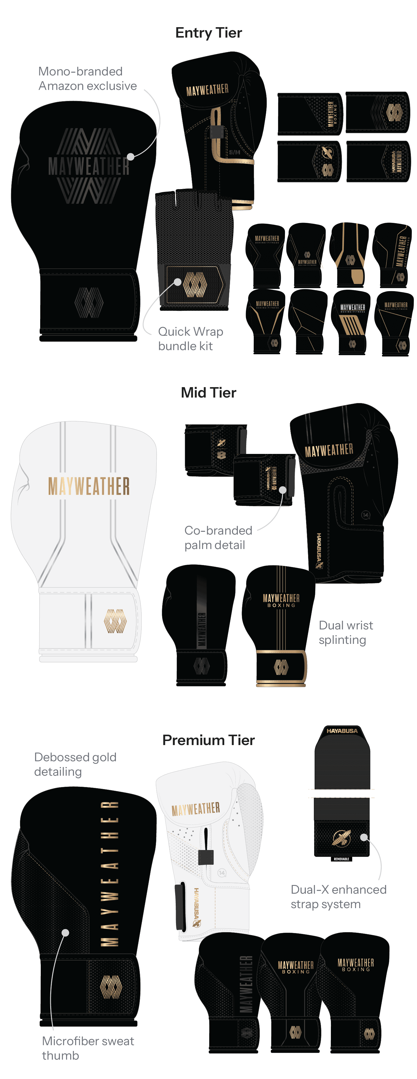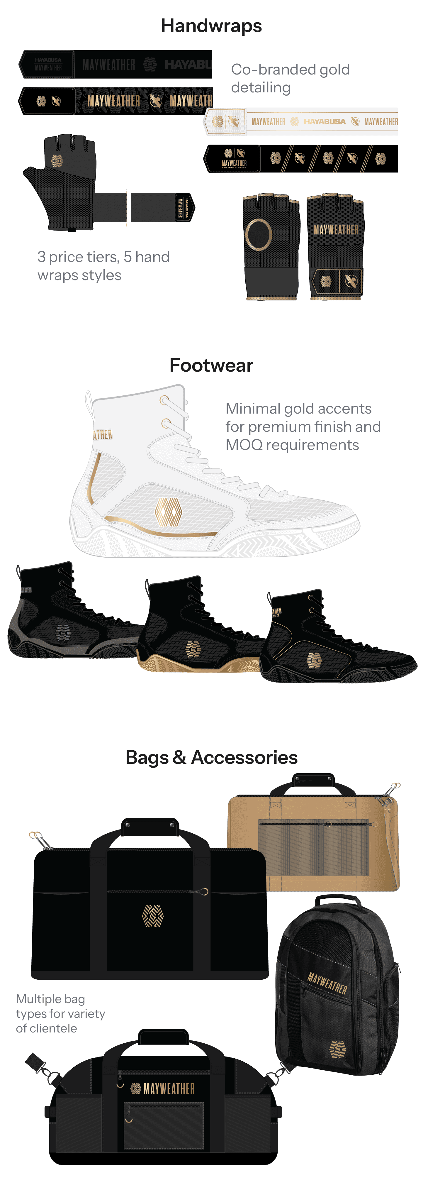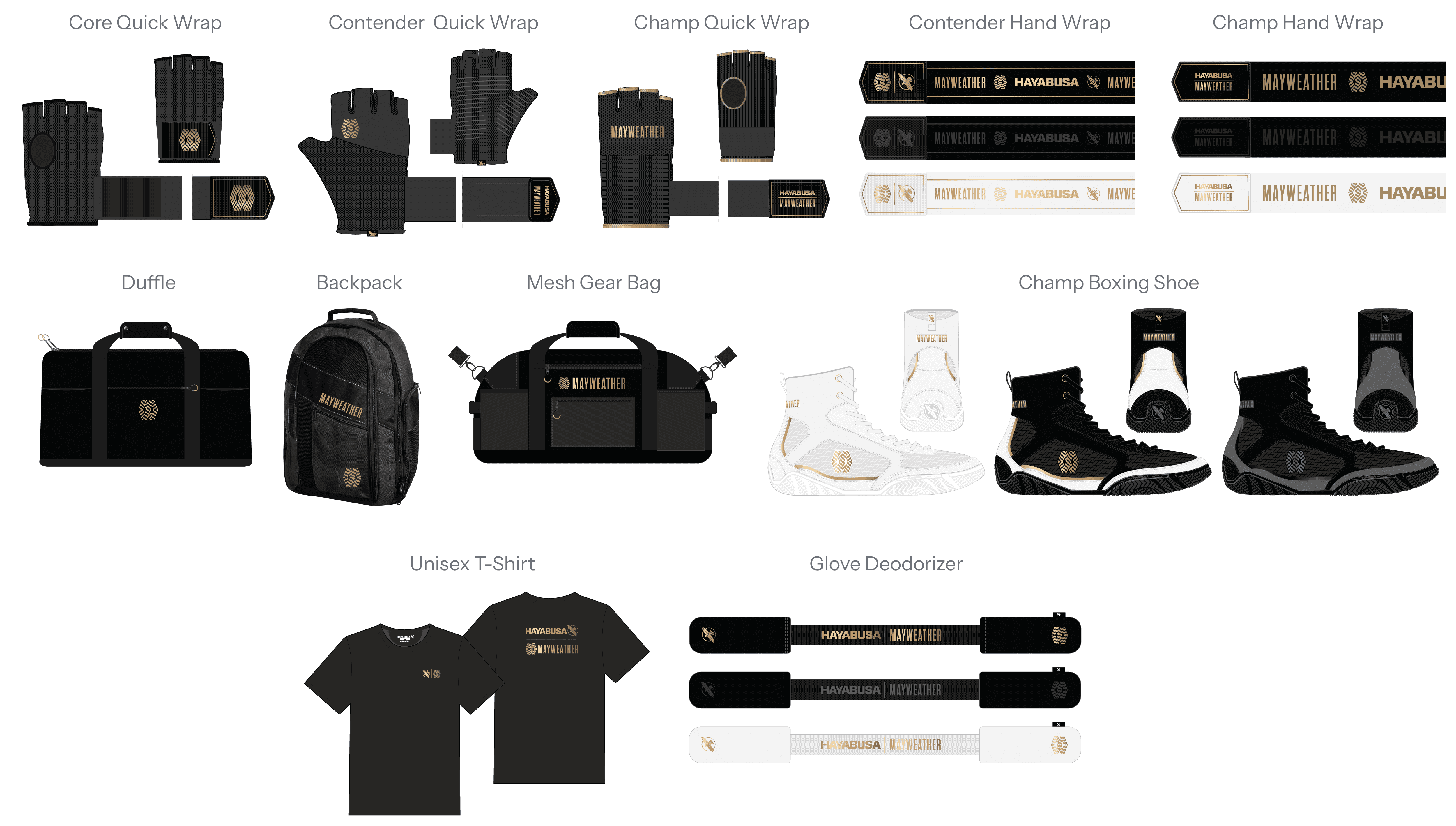 The final collection unified Hayabusa’s performance standards with Mayweather’s premium brand positioning through a structured, tiered product system. Spanning gloves, footwear, wraps, and bags, the lineup delivered cohesive design language, material elevation, and performance differentiation across multiple categories.