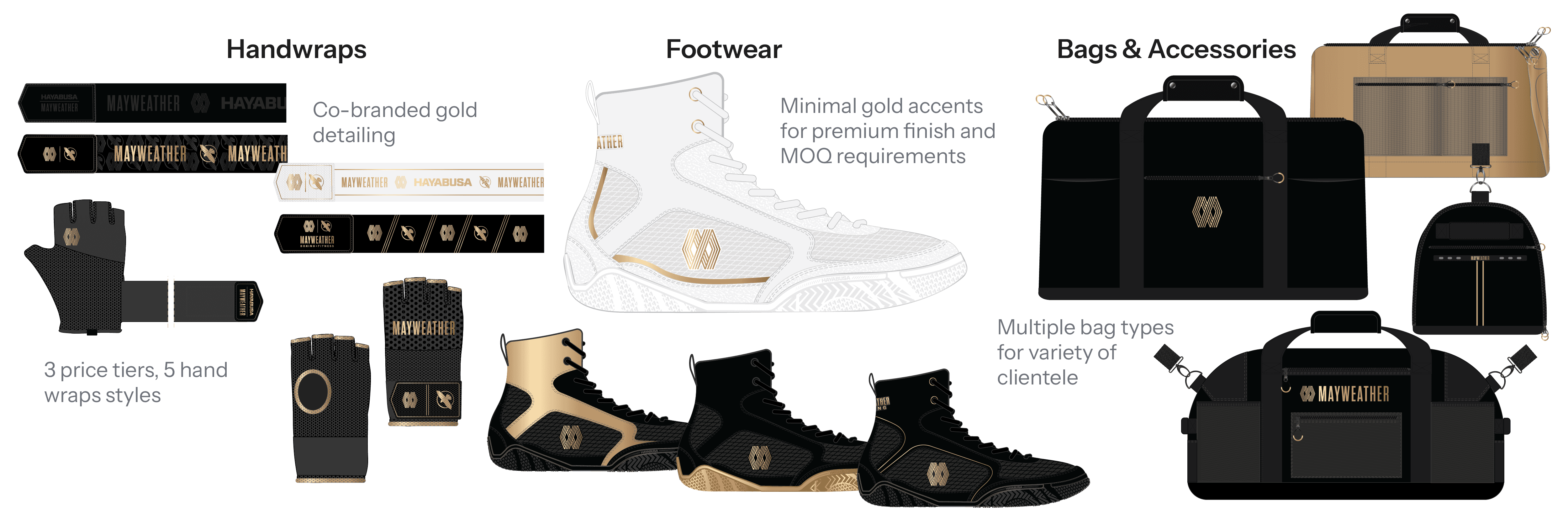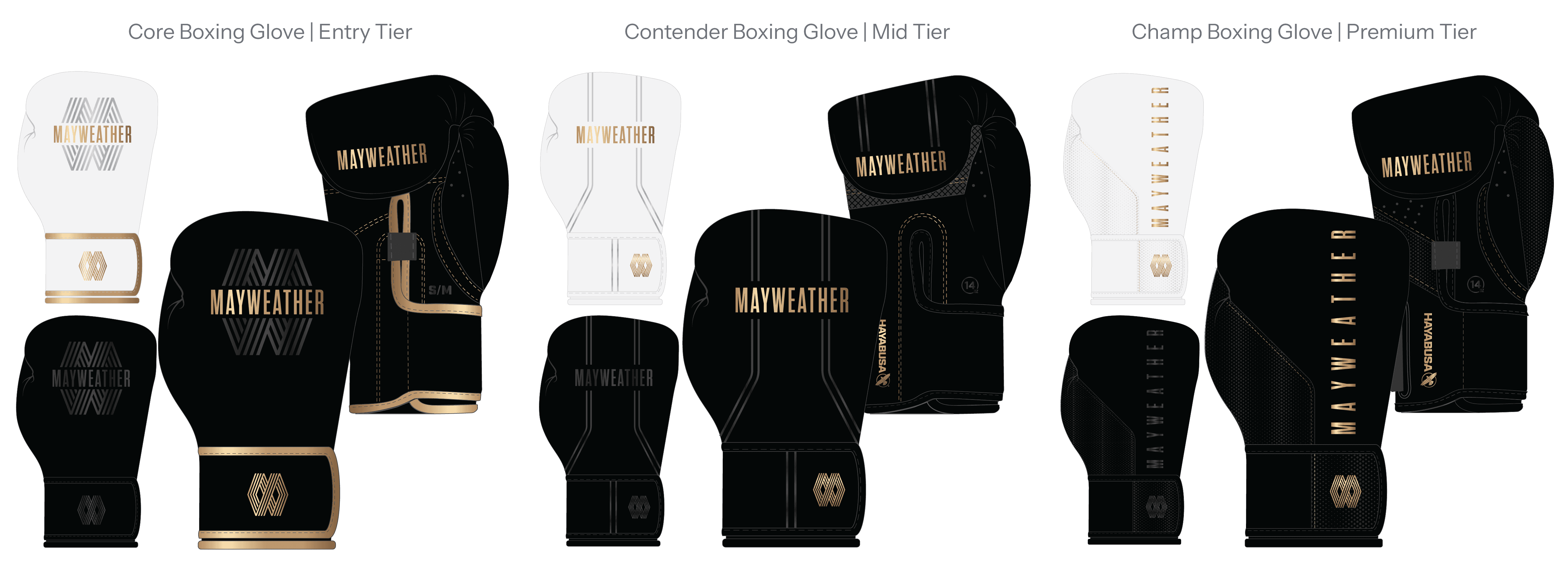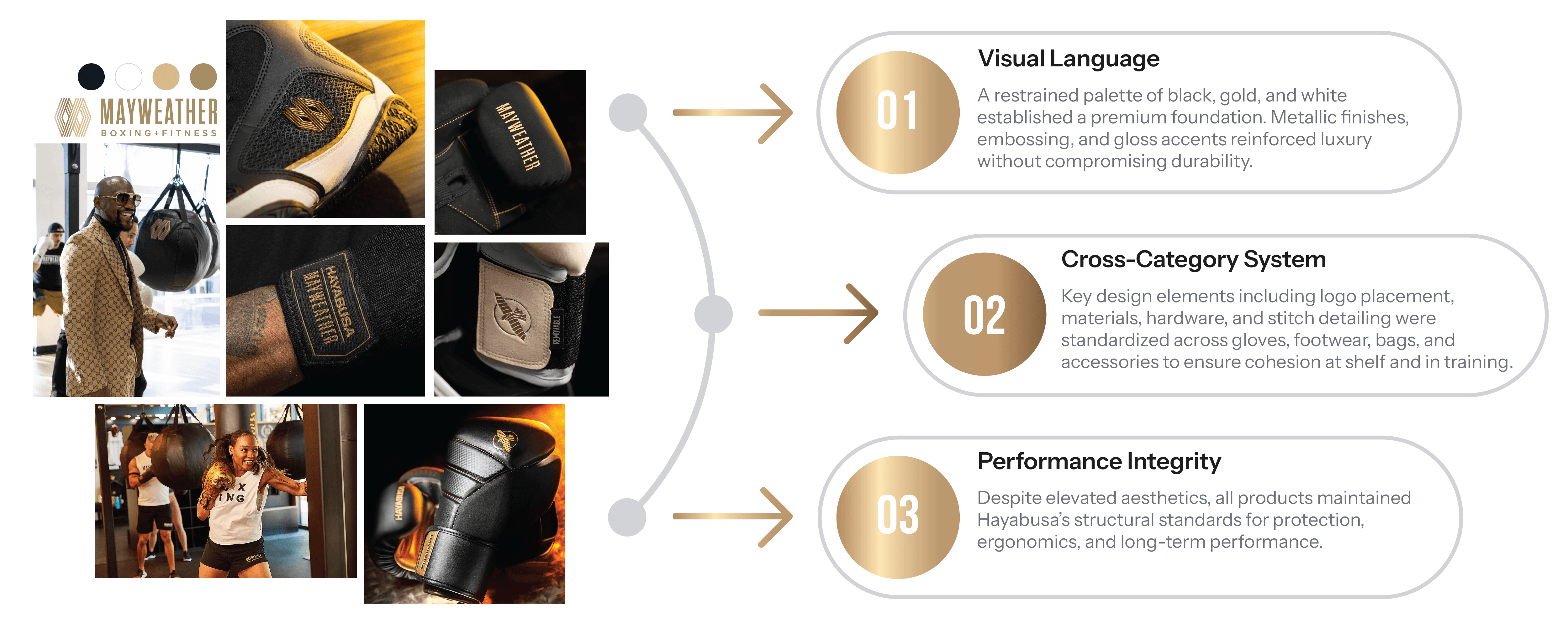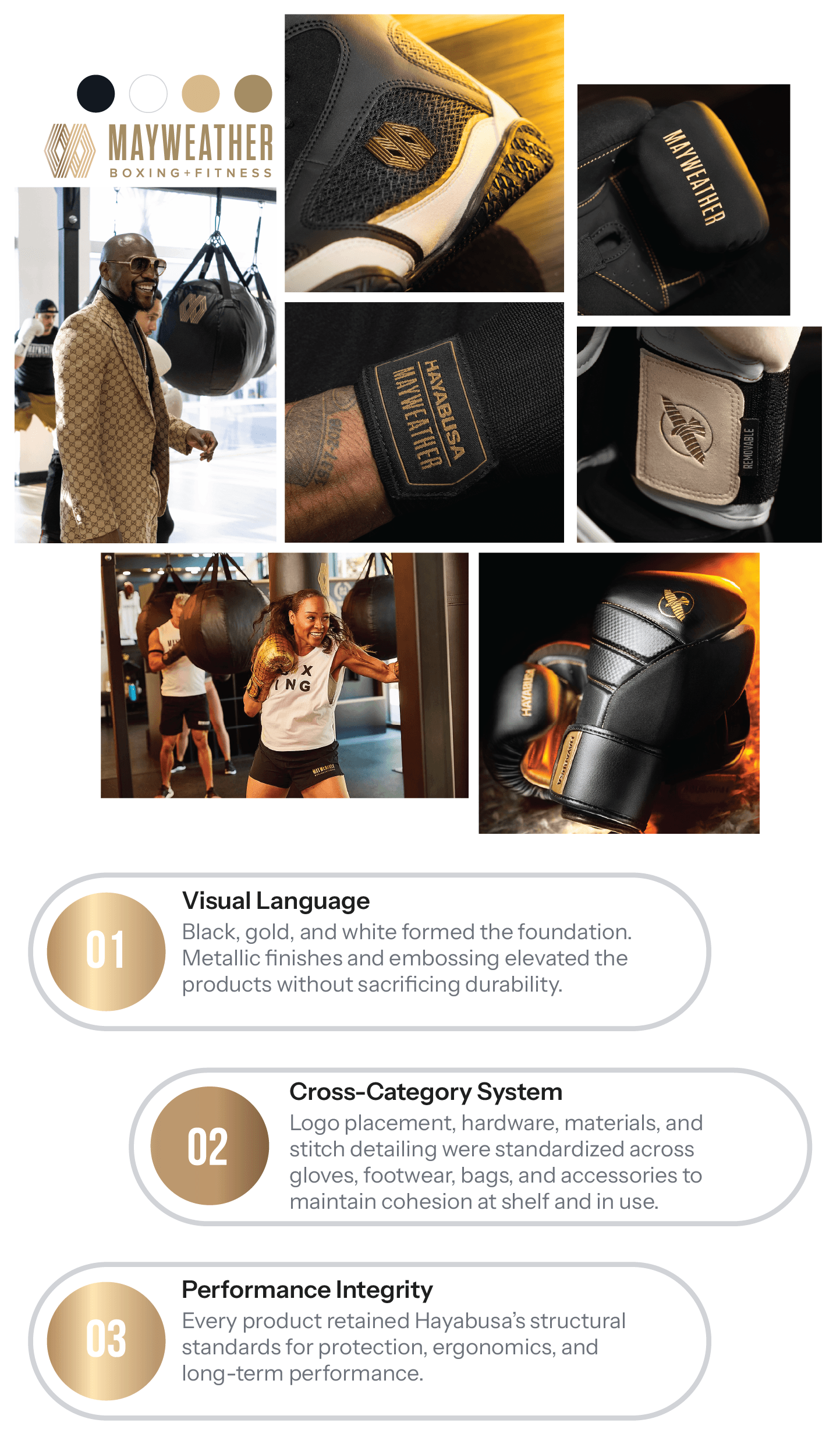 The final collection integrated Hayabusa’s performance standards with Mayweather’s premium brand positioning through a cohesive, tiered product system across gloves, footwear, wraps, and bags.